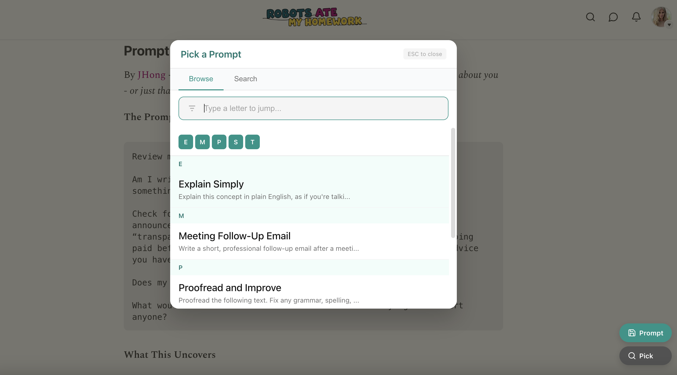 Click on the floating Pick button to browse your prompts alphabetically or search by keyword. One click copies it to your clipboard, ready to paste.