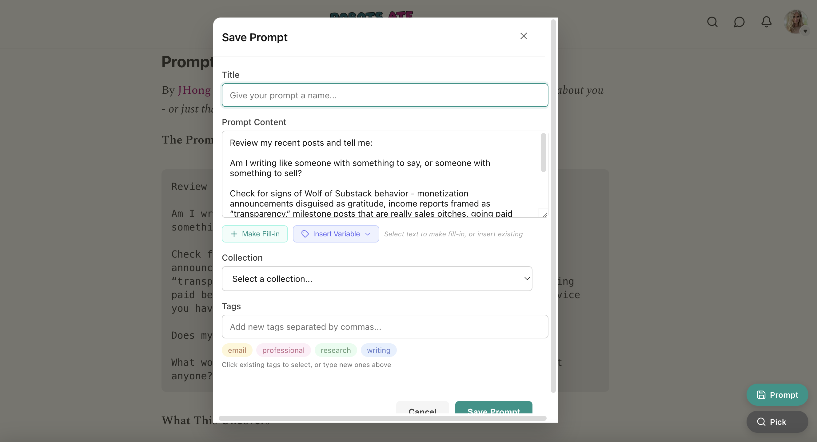 Click on the floating Prompt button to save whatever prompt text you've selected. Add a title, pick a collection, tag it, and you're done.