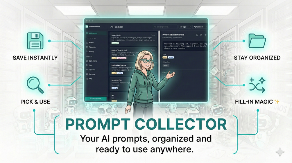 Prompt Collector is a Chrome extension that lets you save, organize, and instantly reuse your AI prompts on any website: ChatGPT, Claude, Gemini, Perplexity, or anywhere else you chat with AI.